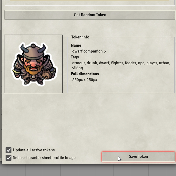 An add-on module for Foundry Virtual Tabletop that allows users to select a random token for a character. Includes filtering the tokens by tag and helpful shortcuts for the GM.